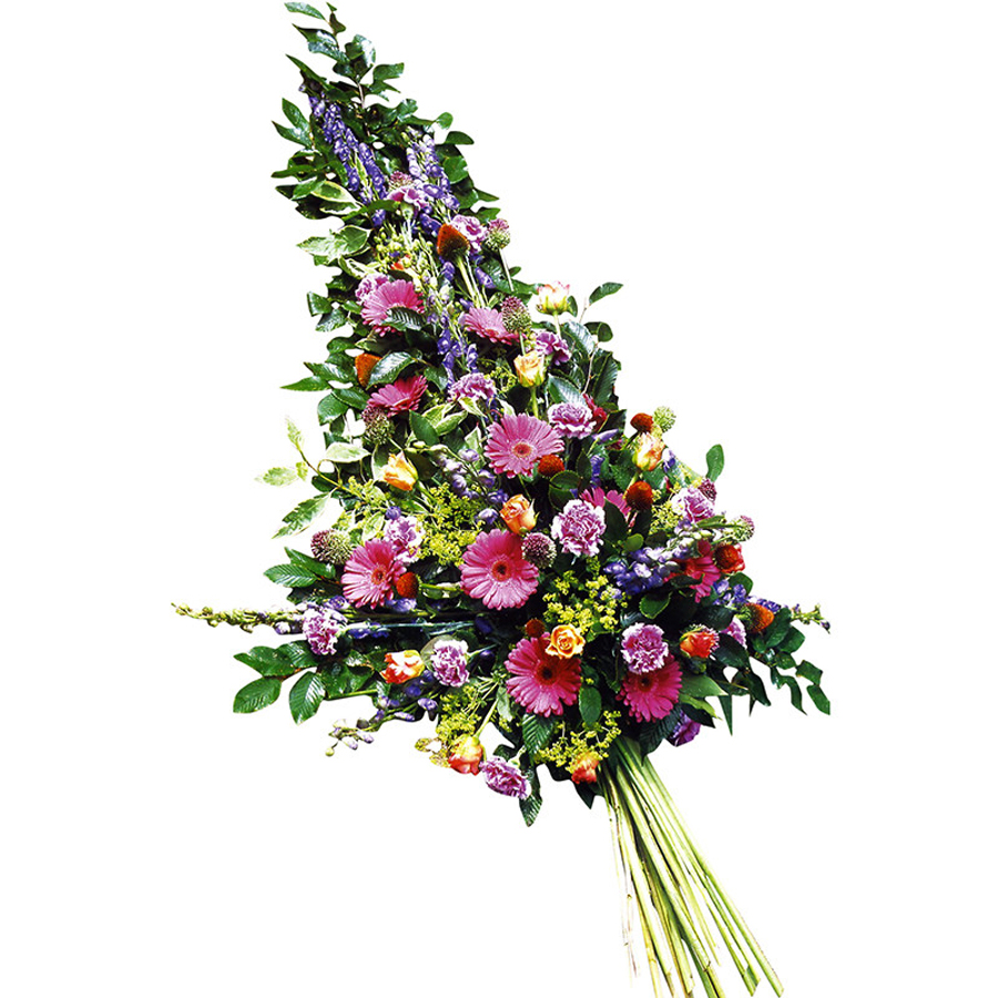 La gerbe funéraire est une composition florale traditionnelle destinée à orner le cercueil ou le lieu de la cérémonie. Contrairement aux bouquets, la gerbe se présente sous forme allongée, souvent plate ou légèrement bombée, ce qui permet une mise en valeur horizontale. Elle est très utilisée pour les cérémonies civiles ou religieuses, et peut être posée au pied du cercueil, sur une stèle, ou au centre de la pièce. Ce type de composition est généralement réservé aux proches du défunt : famille, amis intimes ou collègues de longue date.